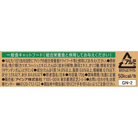 原材料:魚介類(カツオ、フィッシュエキス)、たんぱく加水分解物、酵母エキス、オリゴ糖、増粘安定剤(キサンタンガム)、ビタミンE