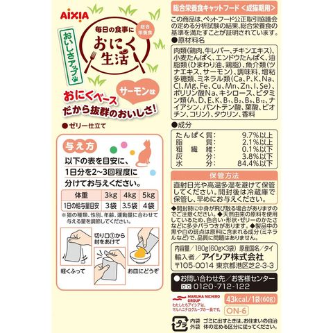 原材料:肉類(鶏肉、牛レバー、チキンエキス)、小麦たんぱく、エンドウたんぱく、油脂類(ひまわり油、鶏脂)、魚介類(ツナエキス、サーモン)、調味料、増粘多糖類、ミネラル類(Ca、P、K、Na、Cl、Mg、Fe、Cu、Mn、Zn、I、Se)、ポリリン酸Na、キシロース、ビタミン類(A、D、E、K、B1、B2、B6、B12、ナイアシン、パントテン酸、葉酸、ビオチン、コリン)、タウリン、香料