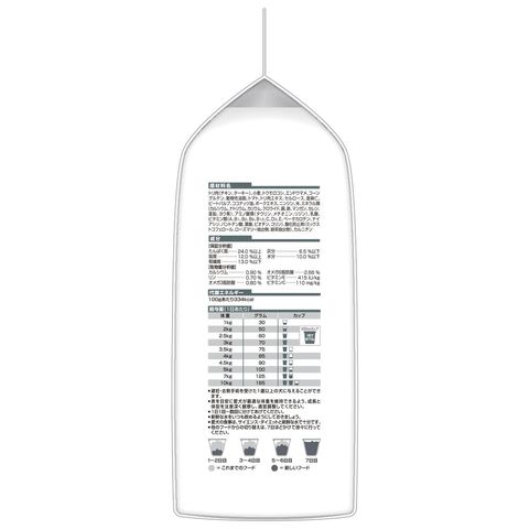 原材料:トリ肉(チキン・ターキー)、小麦、トウモロコシ、エンドウマメ、コーングルテン、動物性油脂、トマト、トリ肉エキス、セルロース、亜麻仁、ビートパルプ、ココナッツ油、ポークエキス、ニンジン、米、ミネラル類(カルシウム、ナトリウム、カリウム、クロライド、銅、鉄、マンガン、セレン、亜鉛、ヨウ素)、アミノ酸類(タウリン、メチオニン、リジン)、乳酸、ビタミン類(B1、B2、B6、B12、C、D3、E、ベータカロテン、ナイアシン、パントテン酸、葉酸、ビオチン、コリン)、酸化防止剤(ミックストコフェロール、ローズマリー抽出物、緑茶抽出物)、カルニチン 給与量を確認してペットに与えてください。