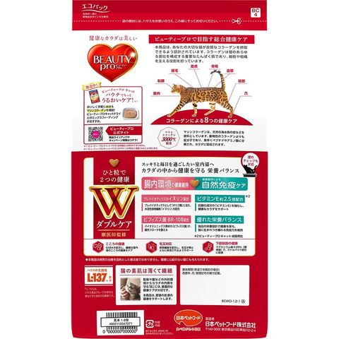 ○健康維持による自然免疫ケア  ・抗酸化成分のビタミンEを約2.5倍配合(ビューティープロ キャット 成猫用比)  ・優れた栄養バランスで健康を保ち、猫に生まれつき備わる免疫力を維持 〇GABAを配合し、繊細な室内猫のこころの健康をケア 〇食物繊維を配合し、毛玉対応 〇マグネシウム値0.09%(標準値)で、ストルバイト結石に配慮。