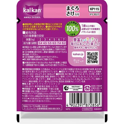 ブランドコンセプト:総合栄養食で100%の愛情アピールポイント:抜群のおいしさに進化!厳選されたまぐろにさけを加えカルカン特製だしで煮込み、ジューシーなゼリー仕立てにしました。