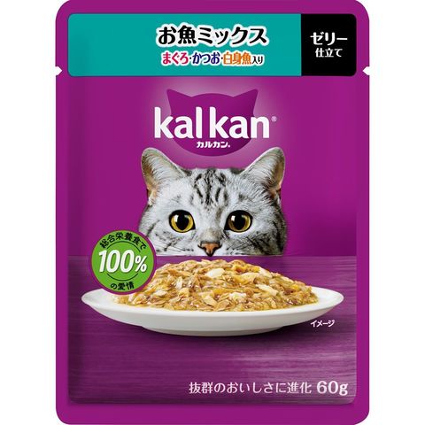 ブランドコンセプト:総合栄養食で100%の愛情アピールポイント:抜群のおいしさに進化!厳選されたまぐろ・かつお・白身魚をカルカン特製だしで煮込み、ジューシーなゼリー仕立てにしました。