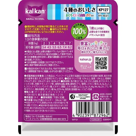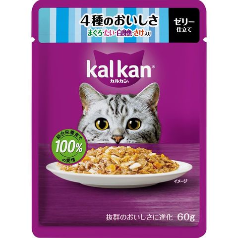ブランドコンセプト:総合栄養食で100%の愛情アピールポイント:抜群のおいしさに進化!厳選されたまぐろ・たい・白身魚・さけをカルカン特製だしで煮込み、ジューシーなゼリー仕立てにしました。