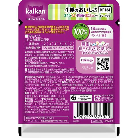 ブランドコンセプト:総合栄養食で100%の愛情アピールポイント:抜群のおいしさに進化!厳選されたまぐろ・たい・白身魚を、ほたてだしを含むカルカン特製だしで煮込み、ジューシーなゼリー仕立てにしました。