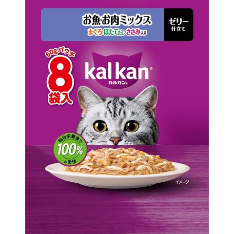 総合栄養食で100%の愛情抜群のおいしさに進化!厳選されたまぐろ・ささみを、ほたてだしを含むカルカン特製だしで煮込み、ジューシーなゼリー仕立てにしました。