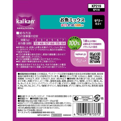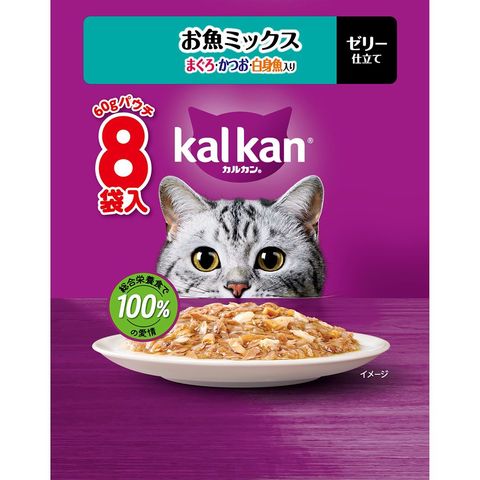 ブランドコンセプト:総合栄養食で100%の愛情アピールポイント:抜群のおいしさに進化!厳選されたまぐろ・かつお・白身魚をカルカン特製だしで煮込み、ジューシーなゼリー仕立てにしました。