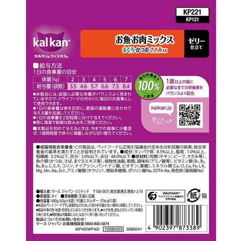 ブランドコンセプト:総合栄養食で100%の愛情アピールポイント:抜群のおいしさに進化!厳選されたまぐろ・かつお・ささみをカルカン特製だしで煮込み、ジューシーなゼリー仕立てにしました。
