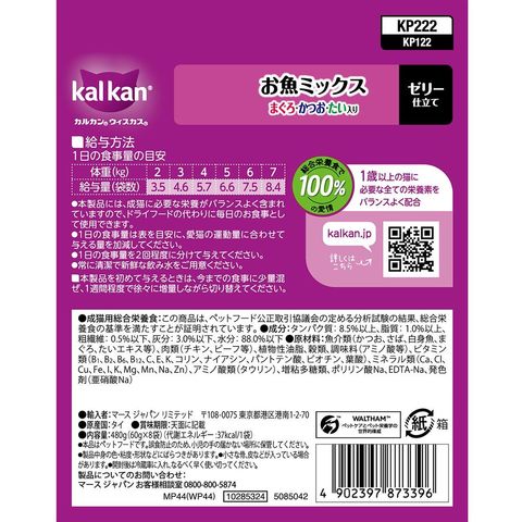 ブランドコンセプト:総合栄養食で100%の愛情アピールポイント:抜群のおいしさに進化!厳選されたまぐろ・かつお・たいをカルカン特製だしで煮込み、ジューシーなゼリー仕立てにしました。