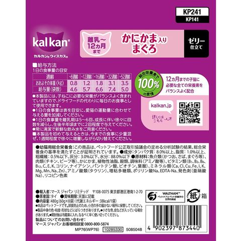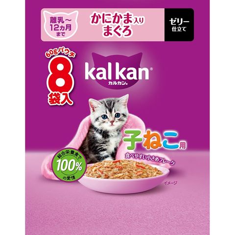 ブランドコンセプト:総合栄養食で100%の愛情アピールポイント:抜群のおいしさに進化!厳選されたまぐろにかにかまを加え、カルカン特製だしで煮込み、ジューシーなゼリー仕立てにしました。