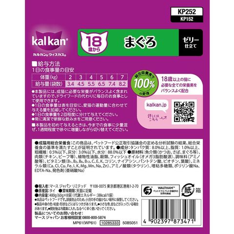 ブランドコンセプト:総合栄養食で100%の愛情アピールポイント:抜群のおいしさに進化!厳選されたまぐろをカルカン特製だしで煮込み、ジューシーなゼリー仕立てにしました。