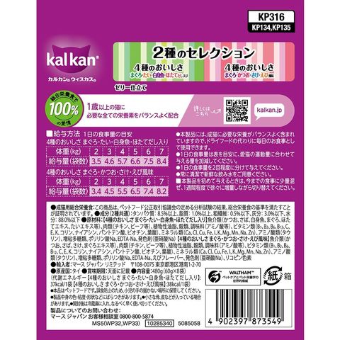 使用方法・給与方法:【4種のおいしさ まぐろ・たい・白身魚・ほたてだし入り】体重2kg:3.5袋、3kg:4.6袋、4kg:5.7袋、5kg:6.6袋、6kg:7.5袋、7kg:8.4袋【4種のおいしさ まぐろ・かつお・さけ・えび風味】体重2kg:3.4袋、3kg:4.5袋、4kg:5.5袋、5kg:6.5袋、6kg:7.4袋、7kg:8.2袋 本製品には、成猫に必要な栄養がバランスよく含まれていますので、ドライフードの代わりに毎日のお食事として使用できます。