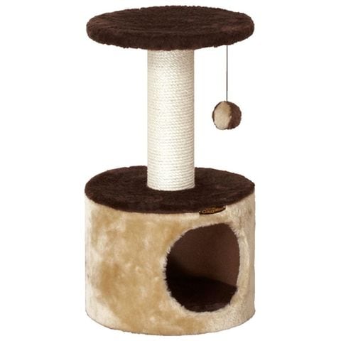 なわを巻いた柱は全面爪磨き●安心、そしてリラックスできるルームの上にサイザル麻巻きつめ磨きと見晴らせるステップが付いた愛猫用小型爪みがきタワー。