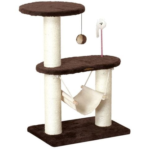 麻なわを巻いた柱は全面爪磨き●ハンモック、そしておもちゃが2個付いた、2段タイプの愛猫用小型爪みがきタワー。