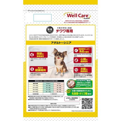 国産の鶏肉を主原料とした犬種別フードチワワの気になる所に特化した犬種別フード使用方法・給与方法:●アダルト 体重(1~1.5kg):35~45g、体重(2~2.5kg):55~65g、体重(3~3.5kg):75~85g、体重(4~4.5kg):95~100g ●シニア 体重(1~1.5kg):30~40g、体重(2~2.5kg):45~55g、体重(3~3.5kg):65~75g、体重(4~4.5kg):85~90g 給与回数:1~2回に分けてお与えください。