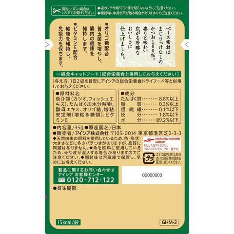 魚介類(カツオ、フィッシュエキス)、たんぱく加水分解物、酵母エキス、オリゴ糖、増粘安定剤(増粘多糖類)、ビタミンE