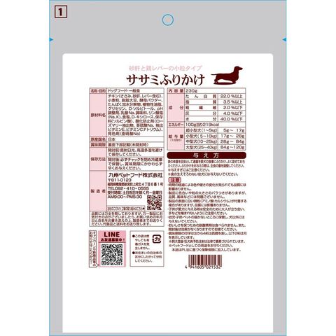 お手入れ・保管方法:超小型犬(1~5kg)5g~17g 小型犬(5~10kg)17g~28g 中型犬(10~25kg)28g~84g 大型犬(25~40kg)84g~120gブランドコンセプト:愛犬満足・お徳用ふりかけアピールポイント:鶏ささみ肉使用ジャーキーを小粒状に仕上げることで、フードによくまざりおいしさを増すことができます。