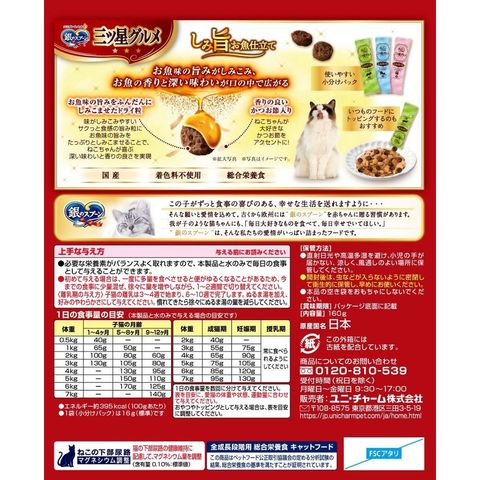 たっぷりしみこませた、お魚味の旨み・お魚味の旨みがしみこんで、深い味わいと香りの良さを実現 ・ネコちゃんが喜ぶかつお節入り ・3種のアソートタイプ ・着色料不使用 ・全成長段階用総合栄養食 ・ねこの下部尿路の健康維持に配慮して、マグネシウム量を調整(含有量0.10%:標準値) ・おいしさと豊かな風味を逃さない、食べきり小分けパック16g(標準)×10袋使用方法・給与方法:与える前にお読みください●必要な栄養素がバランスよく取れますので、本製品と水のみで毎日の食事として与えることができます。