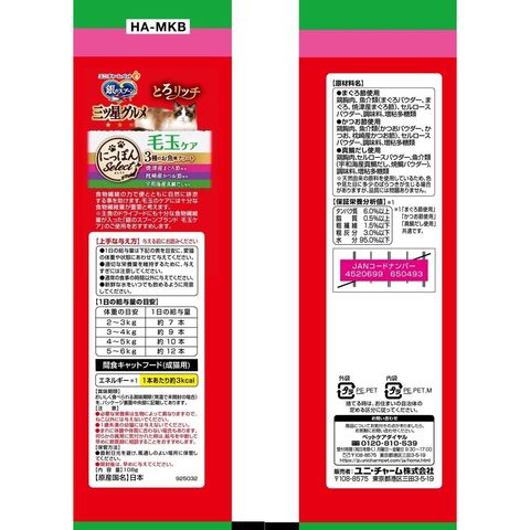 日本各地の厳選素材を使用したウェットおやつ・日本各地の「お取り寄せ」素材を使用した、とろ~りウェットタイプの上質なおやつ ・6gで食べきりサイズ ・国産、無着色 ・毛づくろい等で飲み込んでしまった毛の排泄を助けるために、食物繊維を配合 ・ひと袋に3種類の味が詰まったアソートタイプ使用方法・給与方法:与える前にお読みください●1日の給与量は下記の表を目安に、愛猫の体重や状態にあわせて与えてください。