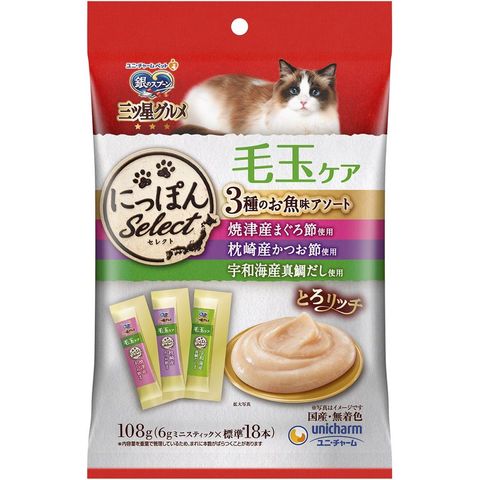 ユニ・チャーム 銀のスプーン 三ツ星グルメ おやつにっぽんselectとろリッチ毛玉ケア3種まぐろ節かつお節真鯛だし 108g×20