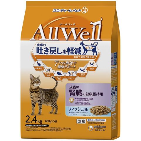 ユニ・チャーム AllWell 成猫の腎臓の健康維持用フィッシュ味挽き小魚とささみフリーズドライパウダー入り 2.4kg×4