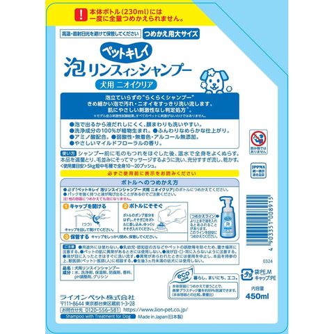 ライオンペット ペットキレイ 泡リンスインシャンプー 犬用 ニオイクリア つめかえ用 大サイズ450ml×16