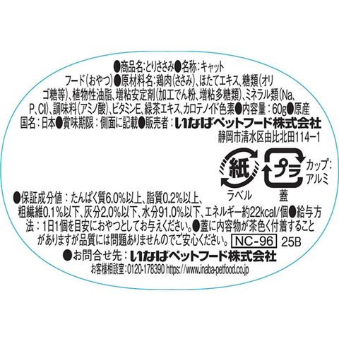 鶏肉(ささみ)、ほたてエキス、糖類(オリゴ糖等)、植物性油脂、増粘安定剤(加工でん粉、増粘多糖類)、ミネラル 類(Na、P、Cl)、調味料(アミノ酸)、ビタミンE、緑茶エキス、カロテノイド色素