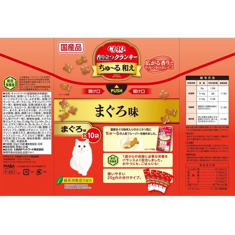 穀類(とうもろこし、小麦粉、コーングルテンミール、ふすま等)、肉類(チキンミール、ポークミール、チキンレバーパウダー等)、動物性油脂、豆類(脱脂大豆)、酵母エキス、セルロース、魚介類(まぐろ節パウダー、まぐろ、まぐろエキス等)、タンパク加水分解物、酵母、糖類(オリゴ糖等)、野菜類(にんじんパウダー、かぼちゃパウダー、ほうれん草パウダー等)、植物性油脂、ミネラル類(Ca、P、K、Na、Cl、Mg、Cu、Mn、Zn、I、Co)、ビタミン類(A、B1、B2、B6、B12、C、D3、E、K3、コリン、ナイアシン、パントテン酸、葉酸、ビオチン)、アミノ酸類(メチオニン、リジン、タウリン)、緑茶エキス、酸化防止剤(ミックストコフェロール、アスコルビン酸等)、増粘安定剤(加工でん粉、増粘多糖類)、調味料(アミノ酸)、紅麹色素