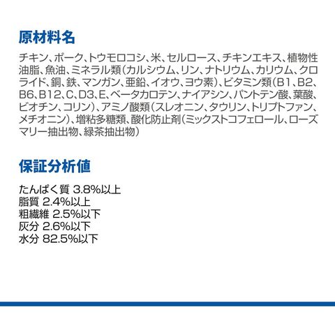 チキン、ポーク、トウモロコシ、米、セルロース、チキンエキス、植物性油脂、魚油、ミネラル類(カルシウム、リン、ナトリウム、カリウム、クロライド、銅、鉄、マンガン、亜鉛、イオウ、ヨウ素)、ビタミン類(B1、B2、B6、B12、C、D3、E、ベータカロテン、ナイアシン、パントテン酸、葉酸、ビオチン、コリン)、アミノ酸類(スレオニン、タウリン、トリプトファン、メチオニン)、増粘多糖類、酸化防止剤(ミックストコフェロール、ローズマリー抽出物、緑茶抽出物)