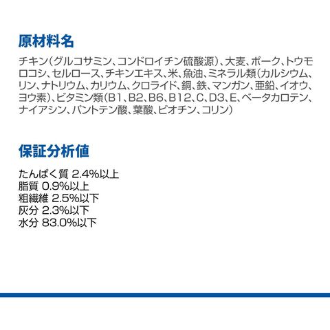 チキン(グルコサミン、コンドロイチン硫酸源)、大麦、ポーク、トウモロコシ、セルロース、チキンエキス、米、魚油、ミネラル類(カルシウム、リン、ナトリウム、カリウム、クロライド、銅、鉄、マンガン、亜鉛、イオウ、ヨウ素)、ビタミン類(B1、B2、B6、B12、C、D3、E、ベータカロテン、ナイアシン、パントテン酸、葉酸、ビオチン、コリン)
