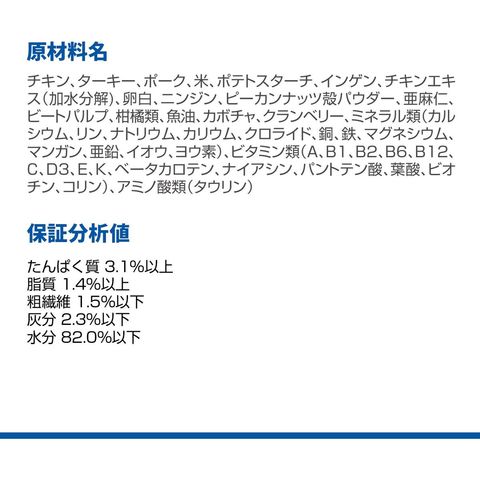チキン、ターキー、ポーク、米、ポテトスターチ、インゲン、チキンエキス(加水分解)、卵白、ニンジン、ピーカンナッツ殻パウダー、亜麻仁、ビートパルプ、柑橘類、魚油、カボチャ、クランベリー、ミネラル類(カルシウム、リン、ナトリウム、カリウム、クロライド、銅、鉄、マグネシウム、マンガン、亜鉛、イオウ、ヨウ素)、ビタミン類(A、B1、B2、B6、B12、C、D3、E、K、ベータカロテン、ナイアシン、パントテン酸、葉酸、ビオチン、コリン)、アミノ酸類(タウリン)