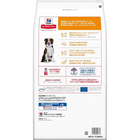 米国の獣医師がNo.1に推奨 CM Research調べ脂肪分約30%オフ・カロリー約15%オフ*で健康的な体重管理をサポート *当社「アダルト中粒成犬用」ドライ製品との比較使用方法・給与方法:2kg55g、4kg90g、6kg120g、8kg150g、10kg175g、15kg240g、20kg295g、30kg400g、40kg500g、50kg590g(200ccカップ1杯で約90g)使用上の注意:製品により、色、香り、大きさ、質感等が多少異なる場合や粒の表面が油っぽく感じられる場合がありますが、原材料由来のもので栄養上の問題はありません。