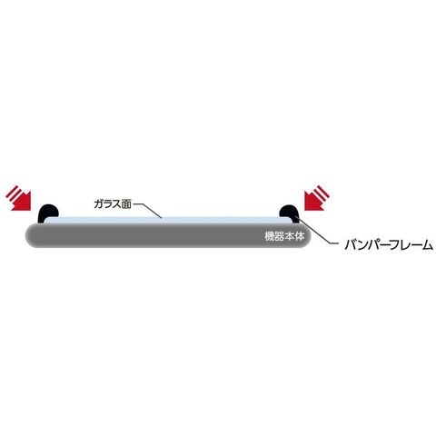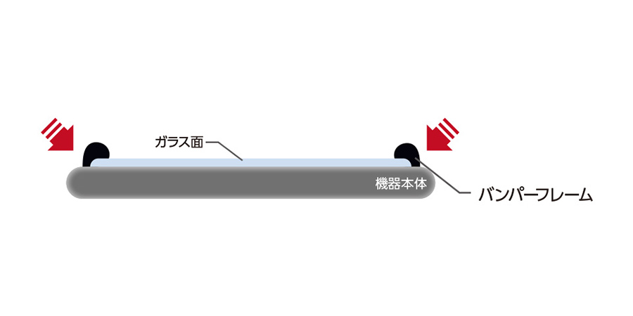 ダブルストロングガラスに、さらにガラス側面をポリカーボネイト製のバンパーフレームで保護することで、角割れがない、本体ディスプレイ部をフルカバーするハイブリッドガラスです。