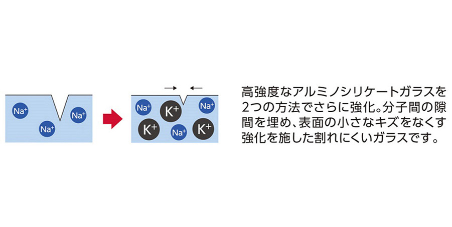 分子間の隙間を埋め、表面の小さな傷をなくす強化を施した割れにくいガラスです。