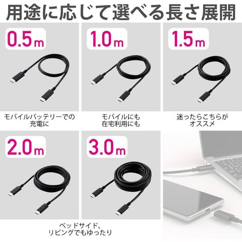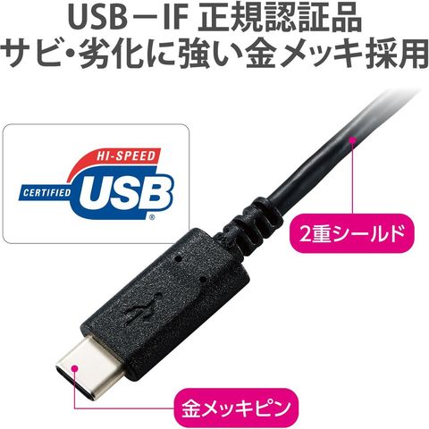 ■USB Type-Cを搭載しているパソコン及び充電器、モバイルバッテリーなどに、USB Type-Cを搭載しているスマートフォンやタブレットを接続し、充電やデータ転送ができるUSB2.0ケーブルです。 ■USB2.0の規格である「Certified Hi-Speed USB(USB2.0)」の正規認証品です。 ■USB Type-Cコネクタは、ウラ、オモテに関係なくケーブルを挿し込めます。 ■USB Power Deliveryに対応し、最大60W(20V/3A)の大電流を送電可能です。※ご使用になるパソコンやAC充電器などの性能によって、供給される電流値が異なります。 ■最大480Mbpsの高速データ転送が可能です。 ■コネクター形状:USB Type-Cオス-USB Type-Cオス ■対応機種:USB Type-C端子を持つパソコン・充電器・モバイルバッテリーおよび、USB Type-C端子を持つスマートフォン・タブレットなど ■ケーブル長:1.0m ※コネクタ含まず ■ケーブル太さ:3.5mm ■規格:USB2.0規格正規認証品 ■対応転送速度:最大480Mbps ※理論値 ■USB Power Delivery対応:○ ■DisplayPort Alternate Mode対応:× ■プラグメッキ仕様:金メッキピン ■シールド方法:2重シールド ■カラー:ブラック ■パッケージ形態:袋+ステッカー