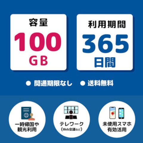 ●1日のデーター通信量に制限なし●Docomo MVNO回線 4G/LTE対応 ●日本全国通信が可能。海外の通信事業者のネットワークを経由しないため、Paypayなどの日本IP認証アプリに対応しております。●SIM装着後から365日ご利用いただけます●長期間少しずつ使いたい方におすすめ●365日超過後もしくは通信容量が100GB超過後は回線が停止となります●プリペイド simの開通手続きやアクティベート不要●APN設定後すぐにご利用いただけます●取扱説明書 日本語、英語、中国語(簡体字/繁体字)、韓国語、タイ語付き●SIMフリー端末、SIMロック解除済のiPhone、iPad、スマホ、 モバイルWiFiルーター(人気のFS030W、FS040Wも対応)、タブレット、LTEパソコンなどにてご利用いただけます●DocomoのSIMロック未解除端末は対応できません●対応周波数:4G/LTE: Band 1 (2.1GHz) / Band 3 (1.8GHz) / Band 19 (800MHz) / Band 21 (1.5GHz) / Band 28 (700MHz) / Band 42 (3.5GHz); 3G/W-CDMA: Band 1 (2.1GHz) / Band 6 (800MHz) / Band 19 (800MHz)に対応●本人確認不要●返却不要●