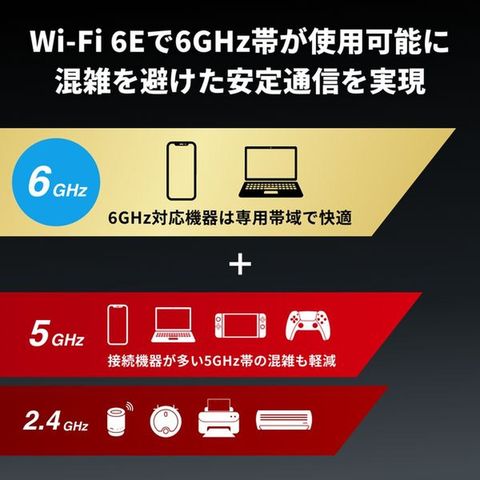 ■Wi-Fi 6 12ストリーム(4x4+4x4+4x4)外付け「トリプルバンドダイポールアンテナ」搭載 ■Wi-Fi 6E 対応 → 6GHzかつトライバンド対応により、混雑が少なく、より低遅延な通信を実現 ■10Gbps回線をフル活用、INTERNET/LAN 10GbEポート搭載 ■Wi-Fi Alliance 標準規格「Wi-Fi EasyMesh R2」対応 ■家庭内のネットワークを脅威から守る「ネット脅威ブロッカー2 プレミアム」搭載 (後日対応) ■設定をほぼ丸ごと引っ越し可能な「スマート引っ越し」対応 ■近距離での通信を高速化する「1024QAM対応」 ■複数端末が同時に接続してもラグが発生しにくい「OFDMA」 ■より強固なセキュリティ「WPA3」対応 ■外出先から安全にアクセスできる「IPsecVPN」対応 ■設定も変更もスマホアプリでかんたん! ■IPv6(IPoE/IPv4 over IPv6)接続サービス対応 ■4K/8K動画を最優先で配信できる「アドバンスドQoS 4K/8Kモード」対応 ■NTT東日本、NTT西日本「フレッツ 光クロス」への対応確認済み ●消費電力:43.0W(最大) ●外形寸法:300×195×75mm(本体のみ、アンテナおよび突起部除く) ●質量:約1515g(本体のみ) ●主な付属品:スタンド、LANケーブル(2m)、ACアダプター、取扱説明書、保証書