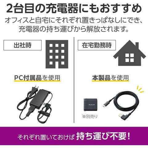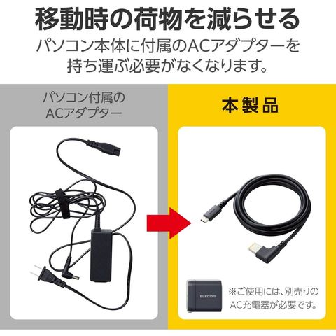 ■Lenovo/NECのノートパソコンで使える充電ケーブルです。最大20V/5Aの100W USB Power Delivery充電に対応しています。対応AC充電器に接続することで、ノートパソコンに高速充電ができます。一部ハイスペックのノートパソコンにも対応可能です。 ■パソコン本体に付属のACアダプターを持ち運ぶ必要がなくなり、移動の際の荷物を減らせます。出張やテレワークの際のパソコンの充電にぴったりです。 ■コネクター形状1:USB Type-Cプラグ ■コネクター形状2:DC角型プラグ(外寸11mm×4.5mm) ■対応機器:ノートパソコン側:角型ポートを搭載し、純正ACアダプターの出力電圧値が19V~20Vのノートパソコン、AC充電器側:USB Type-Cポートを搭載し、USB Power Delivery対応のAC充電器(AC100-240V(50Hz/60Hz)) ※単独ポート定格出力電圧19V~20V(単独ポート最大出力100W以上推奨) ■USB Power Delivery対応:○ ■対応電圧/電流:最大20V/5A ■ピンメッキ仕様:金メッキピン(USB Type-Cプラグ側) ■ケーブル長:約2m ※コネクター含まず ■ケーブル径:約4.6mm ■ケーブルカラー:ブラック ■パッケージ形態:袋+ステッカー ■環境配慮事項:EU RoHS指令準拠(10物質)、簡易パッケージ