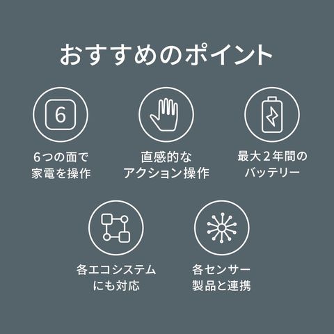 コントロール、操作複数割当、シーンモード、アクションモード、Alexa HomeKit、Siri、サイコロ、スマートホーム、遠隔操作、Aqara Home、2年間バッテリー、OTA対応、Zigbee技術