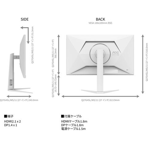 ●付属品:電源ケーブル1.5m、HDMIケーブル1.8m、Displayportケーブル1.8m、スタンド、ベース、保証書、ケーブル付属リスト