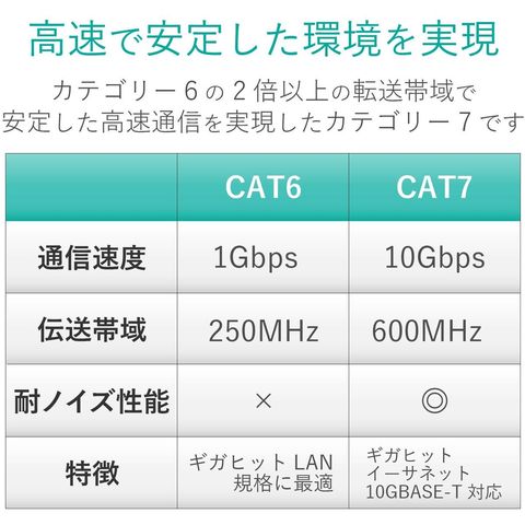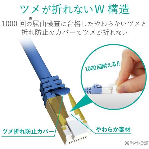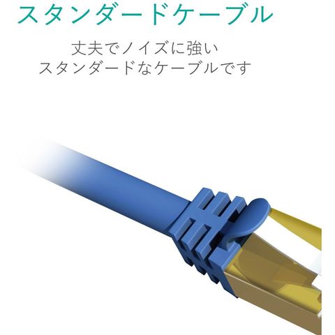 ■高速で安定したネットワーク環境を実現する10GBASE-Tに対応したCat7対応LANケーブルです。 ■ツメ折れ防止プロテクターと屈曲に対する耐久性が高い素材のコネクターを採用したダブル構造で、ツメが折れにくいLANケーブルです。※1000回の屈曲検査に合格(エレコム社検証) ■カラー:ブルーメタリック ■インターフェイス:RJ-45コネクター ■環境配慮事項:EU RoHS指令準拠(10物質) ■規格:Cat7対応(10BASE-T/100BASE-TX/1000BASE-T/1000BASE-TX/10GBASE-T)※Cat7対応はケーブル部のみ。コネクターはRJ-45仕様。 ■伝送速度:10Gbps ■伝送帯域:600MHz ■ケーブル長:約3m ※コネクター含まず ■ケーブル太さ:約5.7mm ■芯数:8芯 ■結線方式:ストレート結線 ■ヨリ対芯線(ツイストペアケーブル):○ ■シールド:有り(ScTP/2重フォイルテープシールド仕様) ■十字介材:× ■外部シース(被膜)材質:PVC ■レングスマーク付:× ■導体構成:ヨリ線(27AWG) ■コネクタ有無:両端コネクター付 ■モールド加工コネクタ:○ ■スリムコネクタ:○ ■爪折れ防止カバー付コネクタ:○ ■ケーブル巻取り機能:× ■パッケージ形態:箱+インナートレー ■爪の折れないコネクタ:○ ■PoE:○