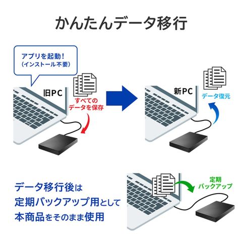 本商品を使用すれば、旧PCから新PCへのデータ移行をかんたんに行うことができます。データ移行後は、バックアップ用HDDとしてそのままご使用いただけます。