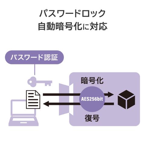 本商品は、USB 10Gbps(USB 3.2 Gen2)対応のセキュリティSSDです。パスワードロック・ハードウェア自動暗号化に対応し、データをセキュアに保存することができます。