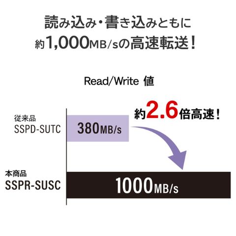 読み込み・書き込みともに最大約1,000MB/sの高速転送が可能!大容量データもサクサク読み書きできるので、映像編集など大容量データを扱う際にも適しています。