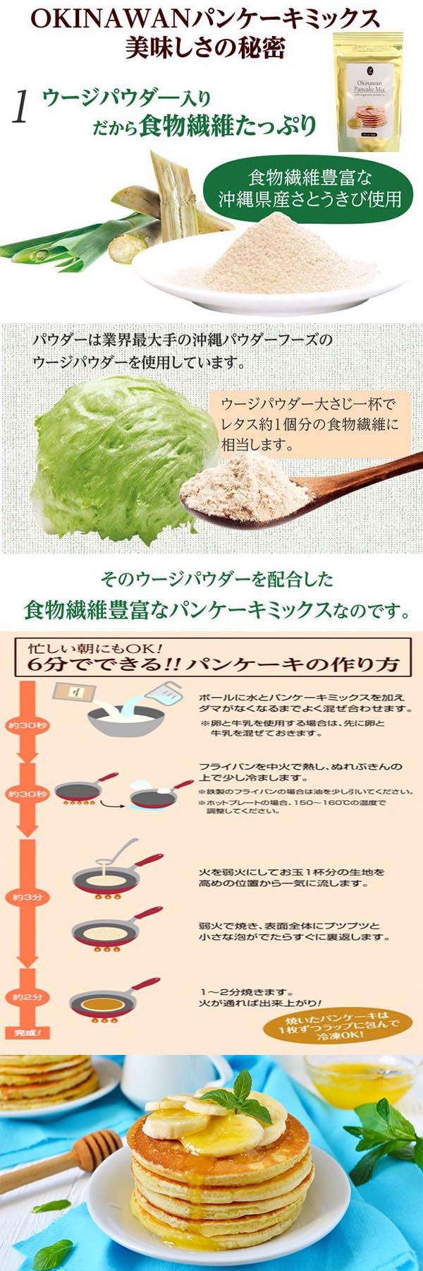 天然由来の食物繊維パウダー「ウージパウダー」を使用した、沖縄パンケーキミックスです。