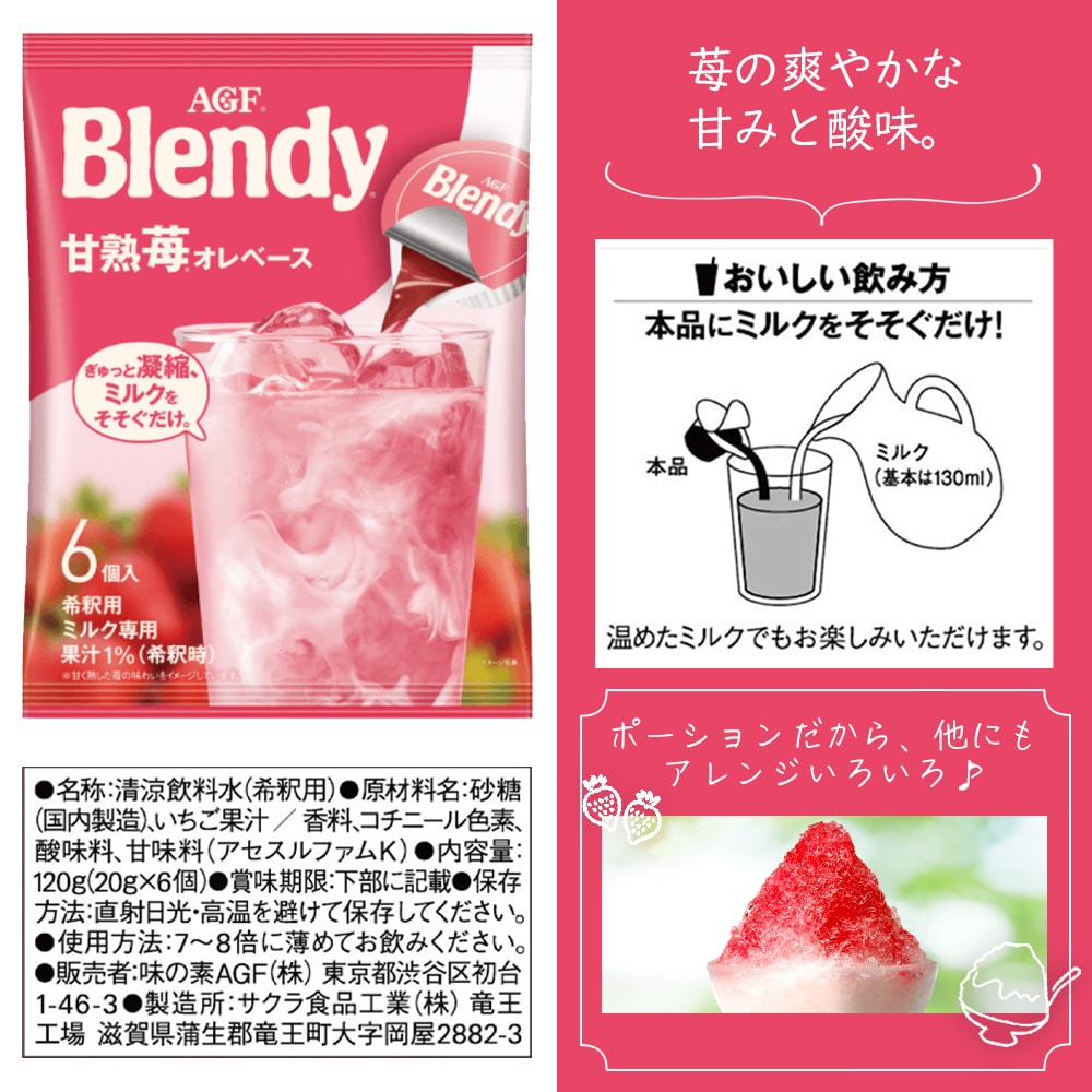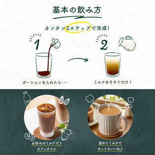 素材を1杯にぎゅっと凝縮しているので、ミルクや水をそそぐだけで簡単に、本格的なカフェの味わいをおうちで簡単に楽しめるポーションタイプの希釈飲料です。