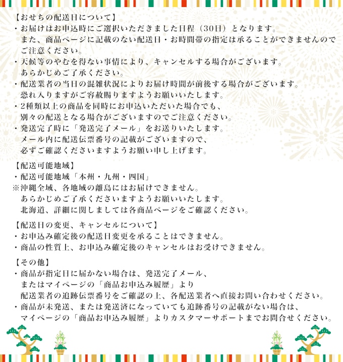 ・配送日時の指定:「発送予定日」に配送日指定の記載がある場合に、ご利用可能です。