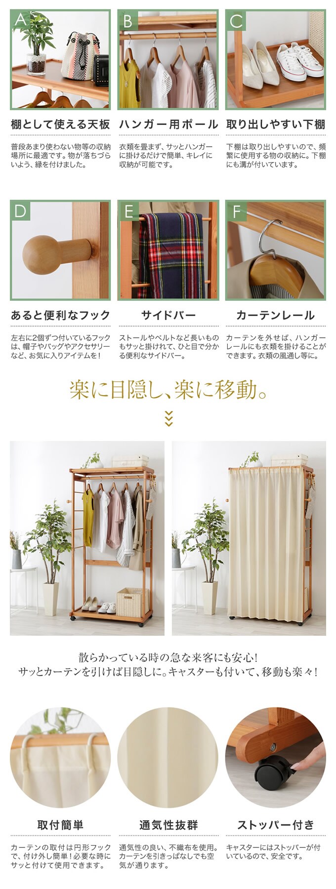 【幅90cm】天然木カーテン付きシングルハンガー | ワンピースなど丈の長い物も掛けられる天然木のカーテン付きハンガー