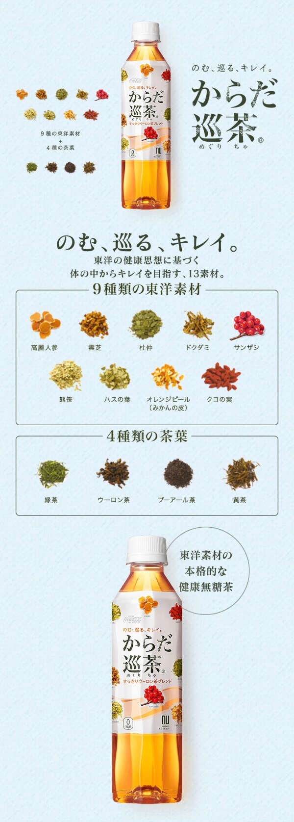 東洋の健康思想に基づいた“からだの巡り”に着目した合計9種類の東洋素材を厳選しバランスよく配合。