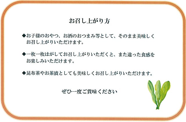 道南産昆布を使用し、特製のたれで煮込んだ昆布を多層に重ね合わせ、食べやすくカットした昆布の風味豊かなヘルシー珍味です。お子様のおやつ、お酒のおつまみ、お茶漬けとしてお召し上がりください。
