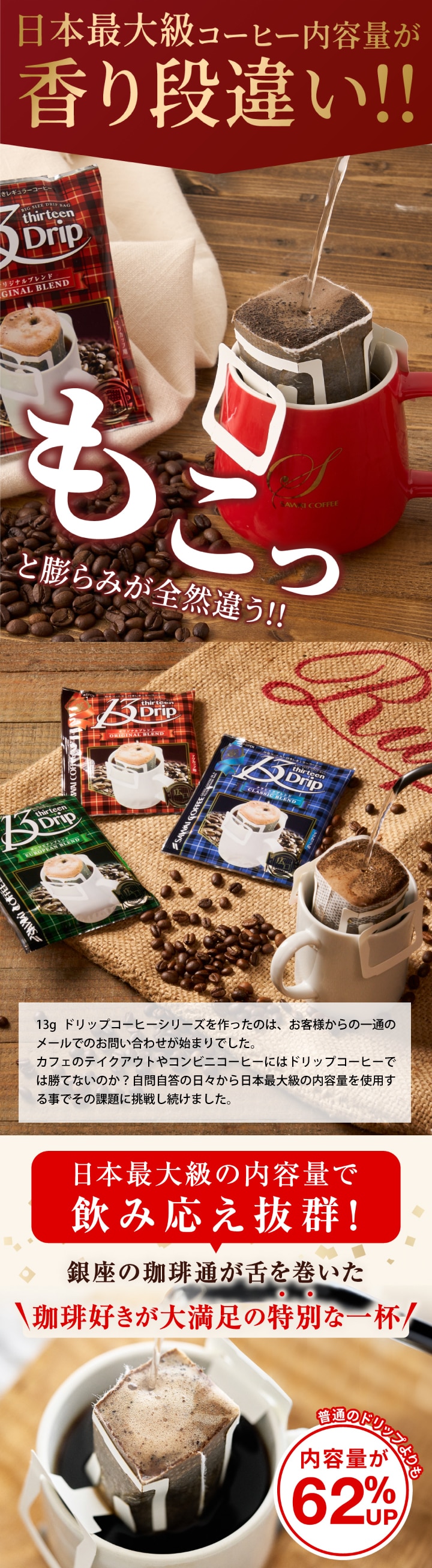 | 内容量 | ●ドリップパックコーヒー ・13Drip オリジナルブレンド 13g×10袋 ・13Drip クラシックブレンド 13g×10袋 ・13Drip ヨーロピアンブレンド 13g×10袋 |